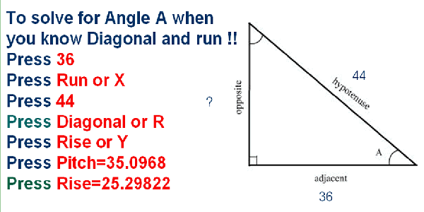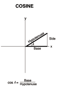 | Cosine means the relationship between the side adjacent or run of a triangle and its Hypotenuse |